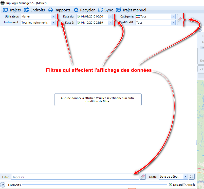 Les "filtres" sont les information tel que l'utilisateur, les instruments , date de debut de fin, les catégorie et qualificatifs