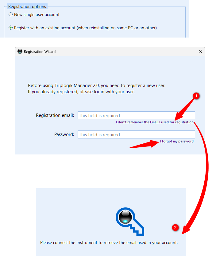 Lorsque vous réinstallez le Manager, si vous ne vous en souvenez pas du Courriel que vous avez initialement utilisé dans votre compte TripLogik Manager, Vous pouvez cliquer sur "Je ne me souviens pas du courriel que j’ai utilisé pour m’inscrire."