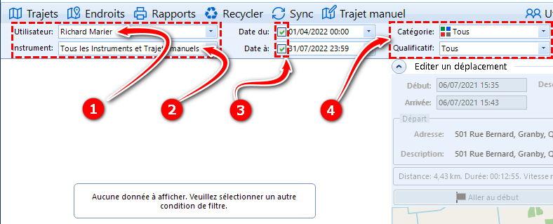 Un message apparaitra dans la liste des trajets afin de vous informer qu'il n'y a aucune donnée sélectionnée par le filtre