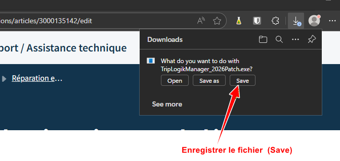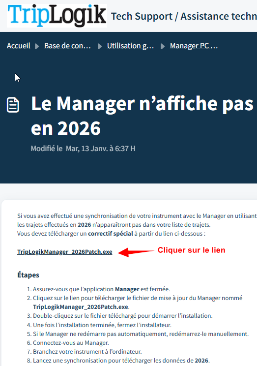 - Cliquez sur le lien pour télécharger le fichier de mise à jour du Manager nommé TripLogikManager_2026Patch.exe.